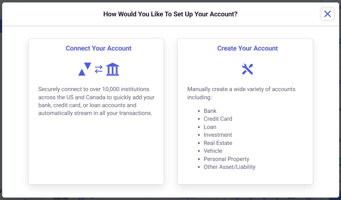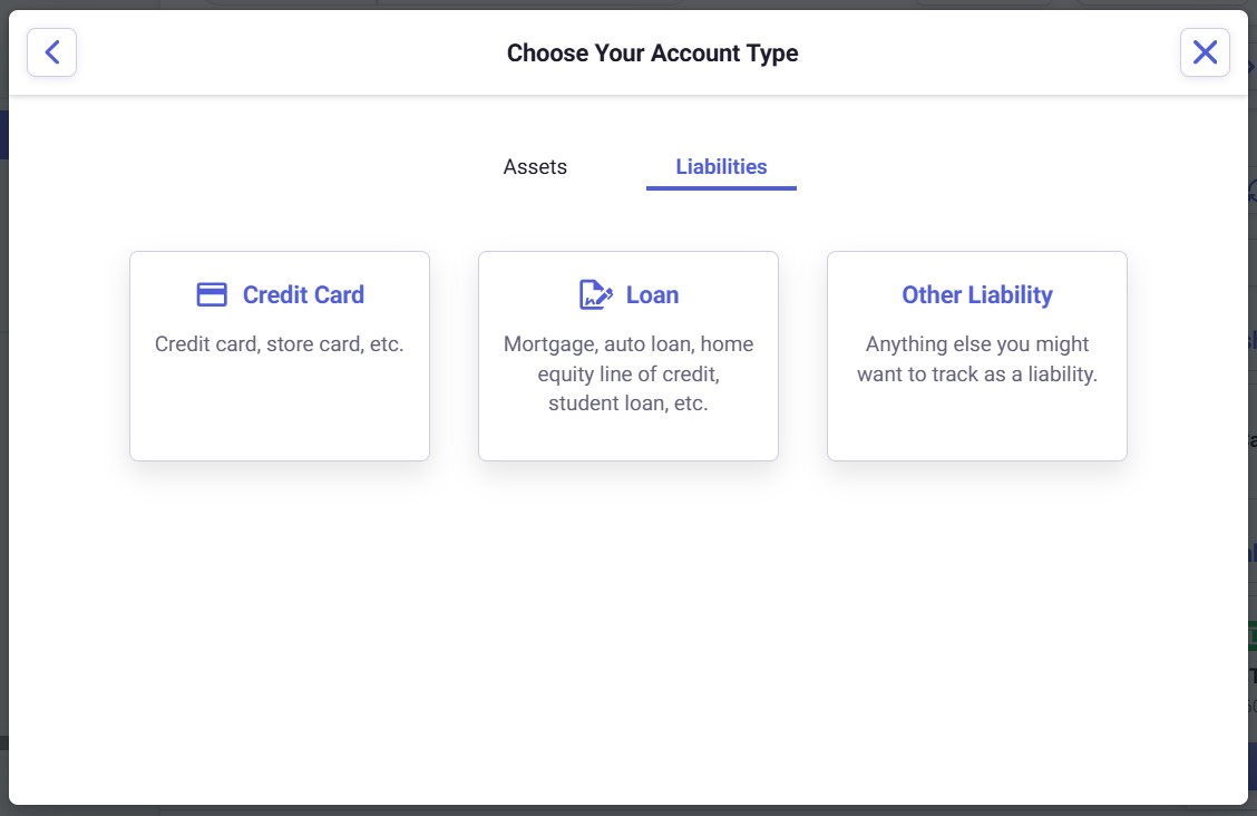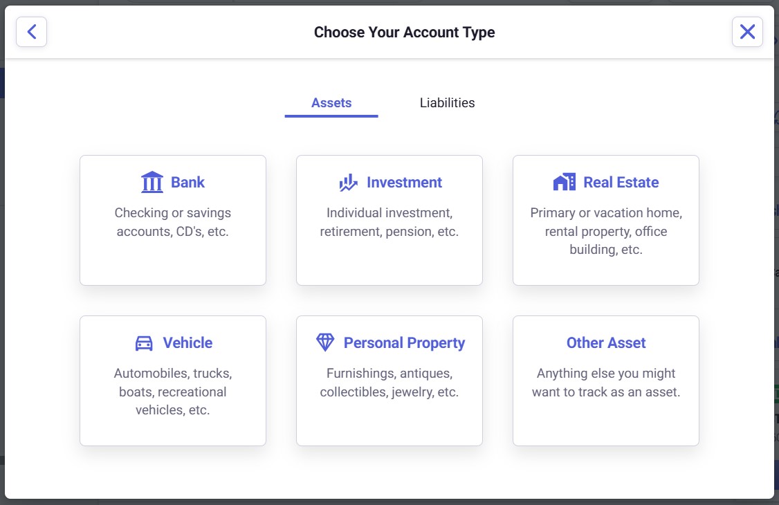 - Balance / Estimated Value - This will be the starting balance or value of the account. You can make adjustments as needed. Balance appears for Liabilities, Bank, and Investment accounts. All others have a Value field.