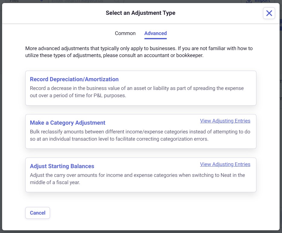 - Advanced adjustments include Record Depreciation/Amortization, Make a Category Adjustment, and Adjust or Set Starting Balances.