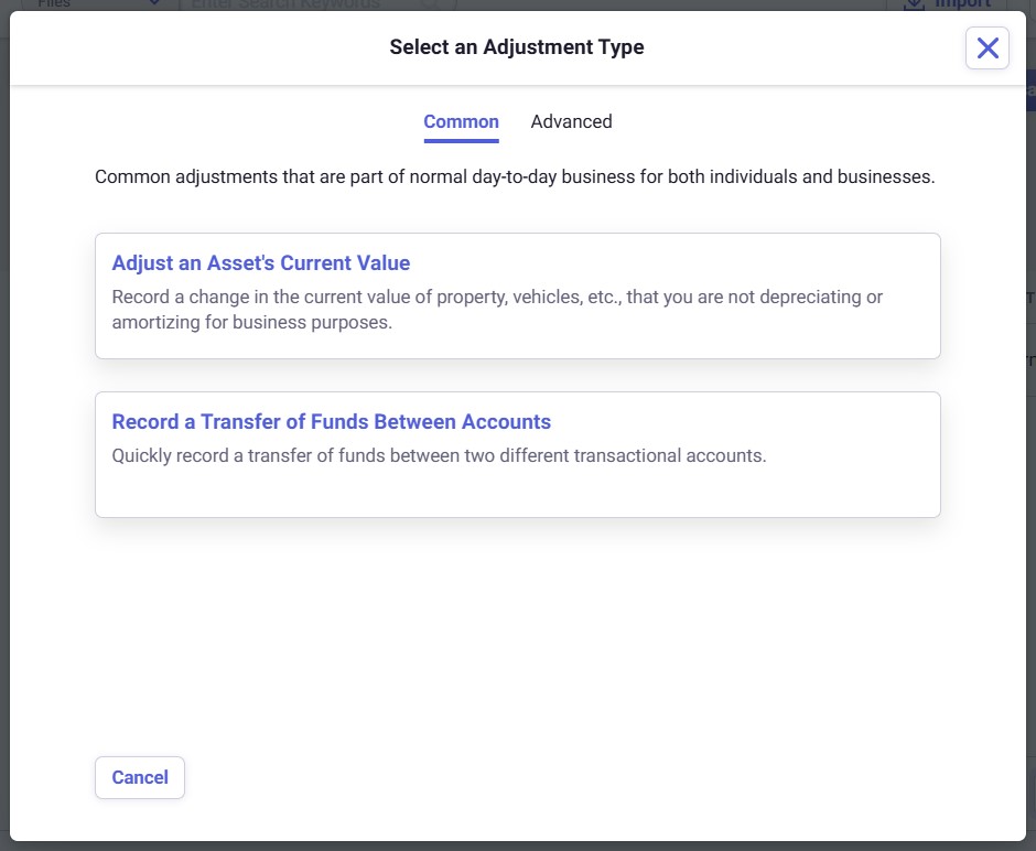 - Common adjustments are Adjust an Asset's Current Value and Record a Transfer of Funds Between Accounts.