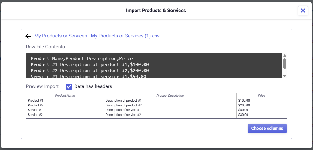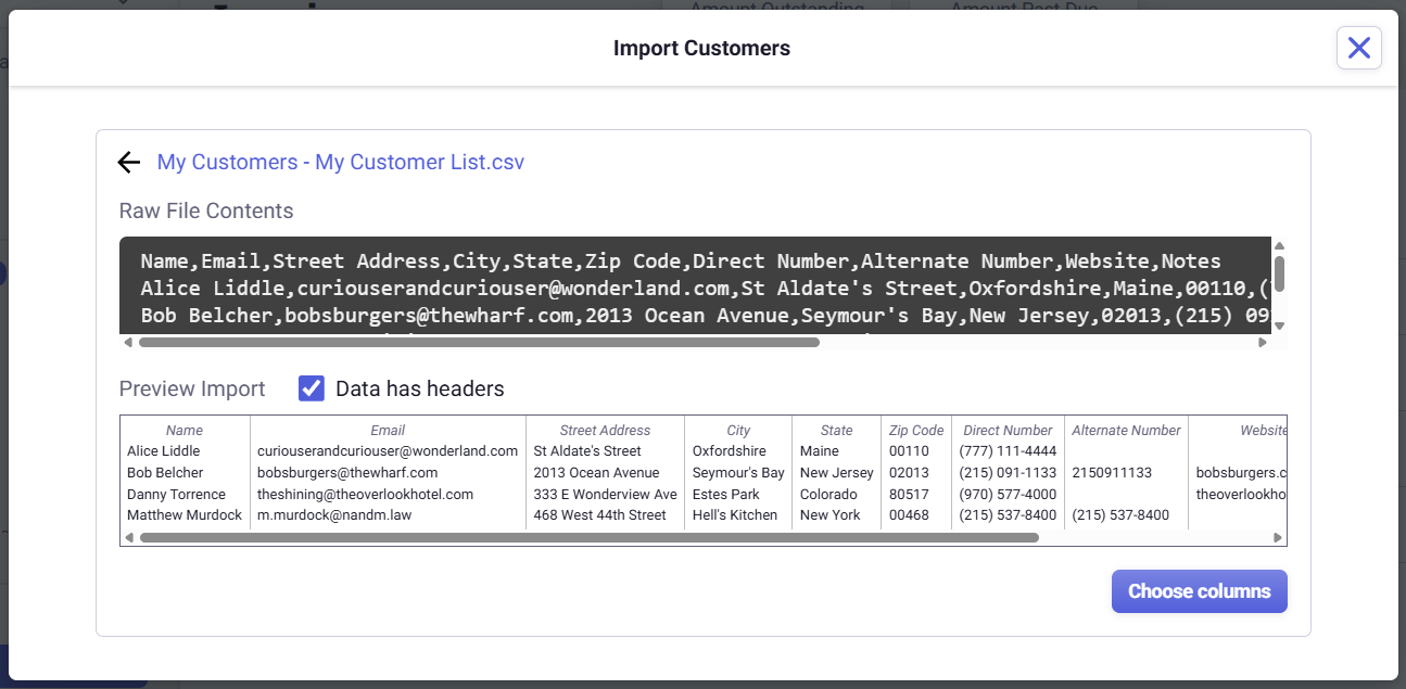- In the Preview Import window, check the box Data has headers if your CSV list has headers. When you are ready, click Choose columns to map your data to fields in Neat.