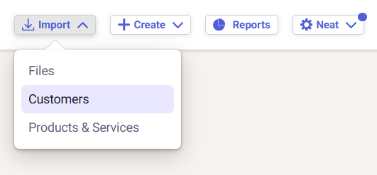 - Log into Neat and click Import in the top right-hand menu. Then click Customers from the drop-down.