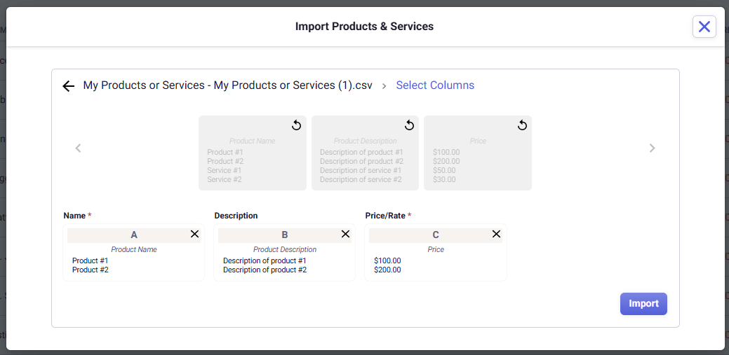 Please Note: At this time, you can only map your product or service name, a description for it, and the price or rate for the item. You must map the Name and Price/Rate field to continue. All other fields are optional.