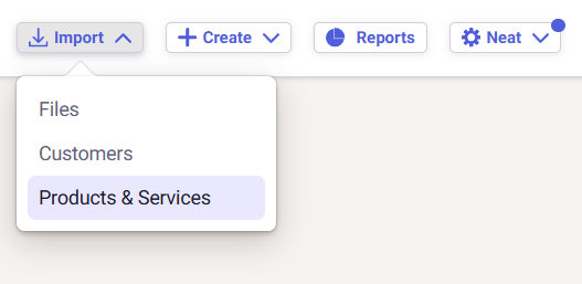 - Log into Neat and click Import in the top right-hand menu. Then click Products & Services from the drop-down.