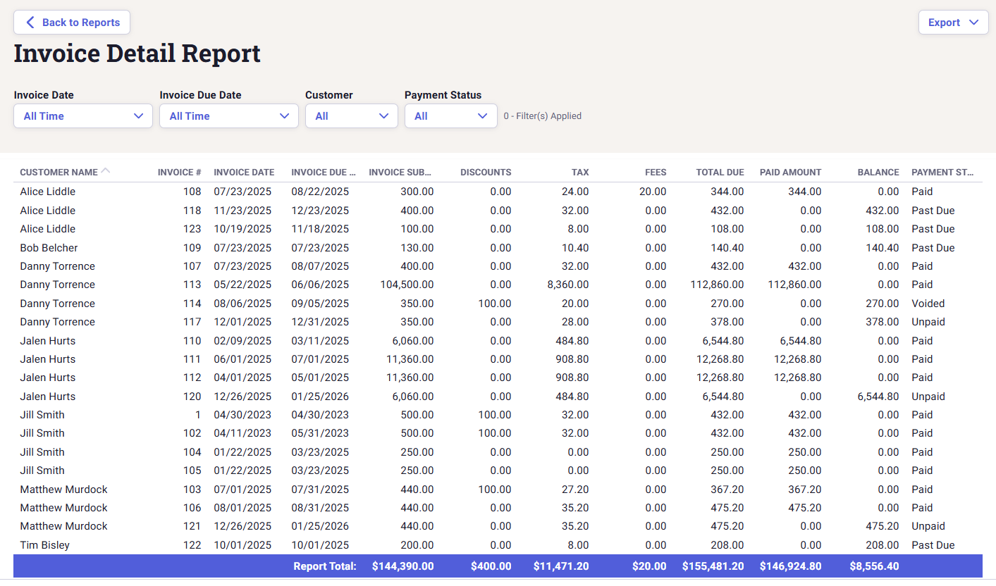 Invoice Detail: The Invoice Detail report provides a comprehensive view of every invoice, including amounts, dates, status, and related customer information. Use this report to review invoice activity, verify accuracy, and manage billing or follow-ups efficiently.