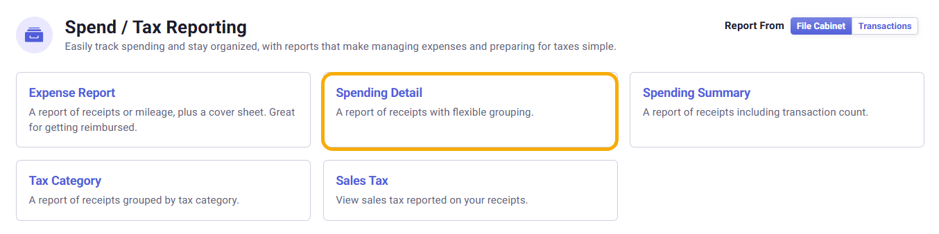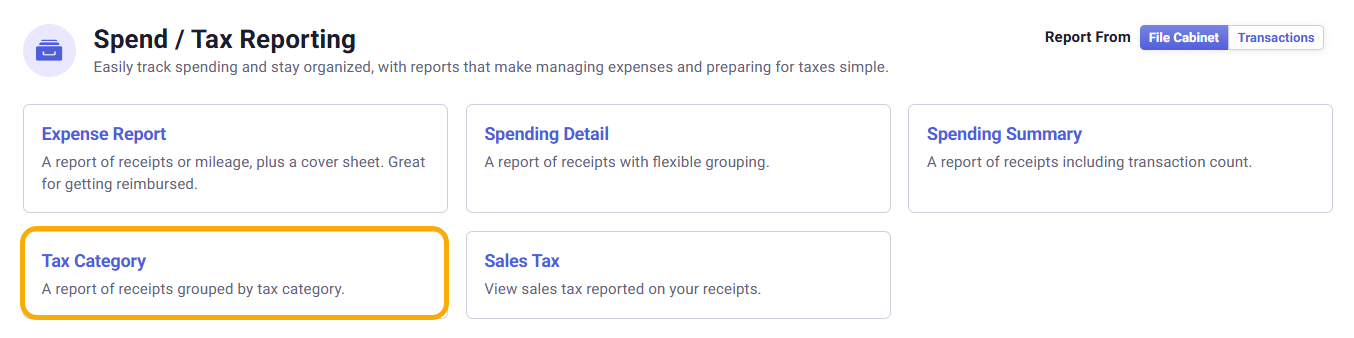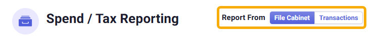 - Under the Spend / Tax Reporting section, change your report settings. If you are creating a report for transactions in the 'Do My Books' section, toggle your report settings to Transactions. If you are creating a report for files in the 'Organize My Files' section, toggle your report settings to File Cabinet.