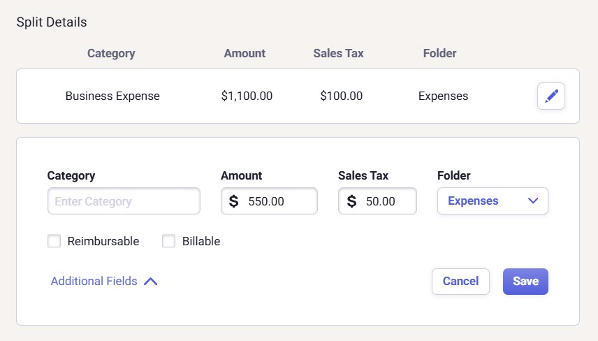 Under Split Details, you will see the first line item ready to edit. You can set the following details: