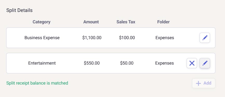 - Continue adding and editing line items until you have accounted for the entire original receipt and the balance indicator turns green, showing "Split receipt balance is matched."