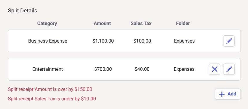 - 🔴 Red Text: The split amounts are unbalanced. The total of your line items does not equal the original receipt's total. You can keep working, but will not be able to finish the entire process until this is resolved.