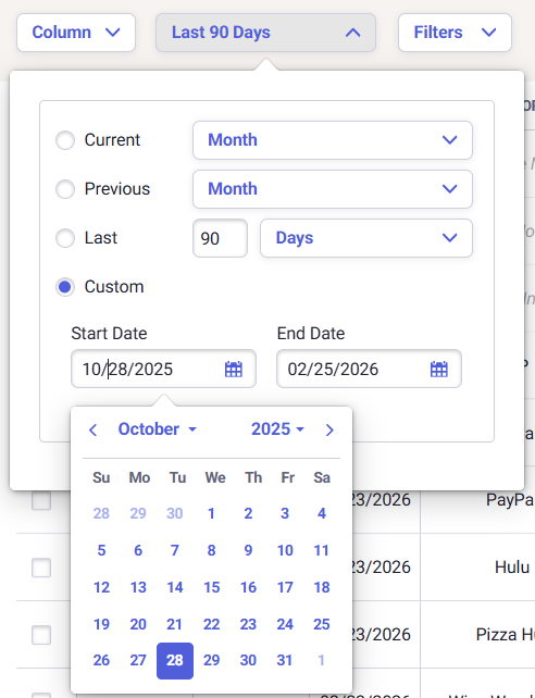 You have 3 options to filter your displayed transactions in Neat: Date, Vendor, Category, Keyword search and Monthly Review status.- By default, you'll start with a date range showing the last 90 days of transactions.