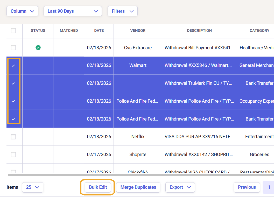 - Select the transactions you want to bulk edit, then click Bulk Edit at the bottom of the transactions grid.