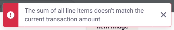 Whenever the total amount of your line items does not equal the total amount of the transaction, the Line Item Balance indicator will present you with a red error message indicating that your items are unbalanced and identifies the amount by which your items are unbalanced.