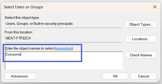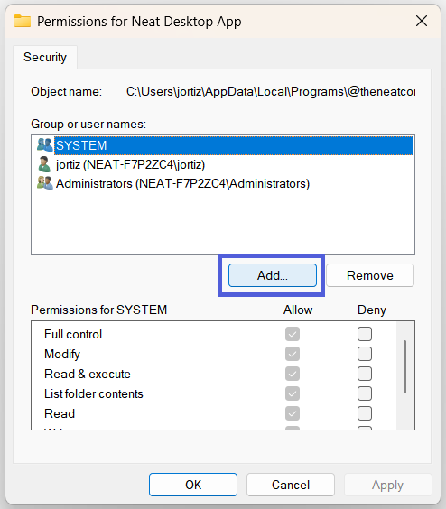 - Next, check the listed Groups or user names. (Ignore SYSTEM & CREATOR OWNER.)